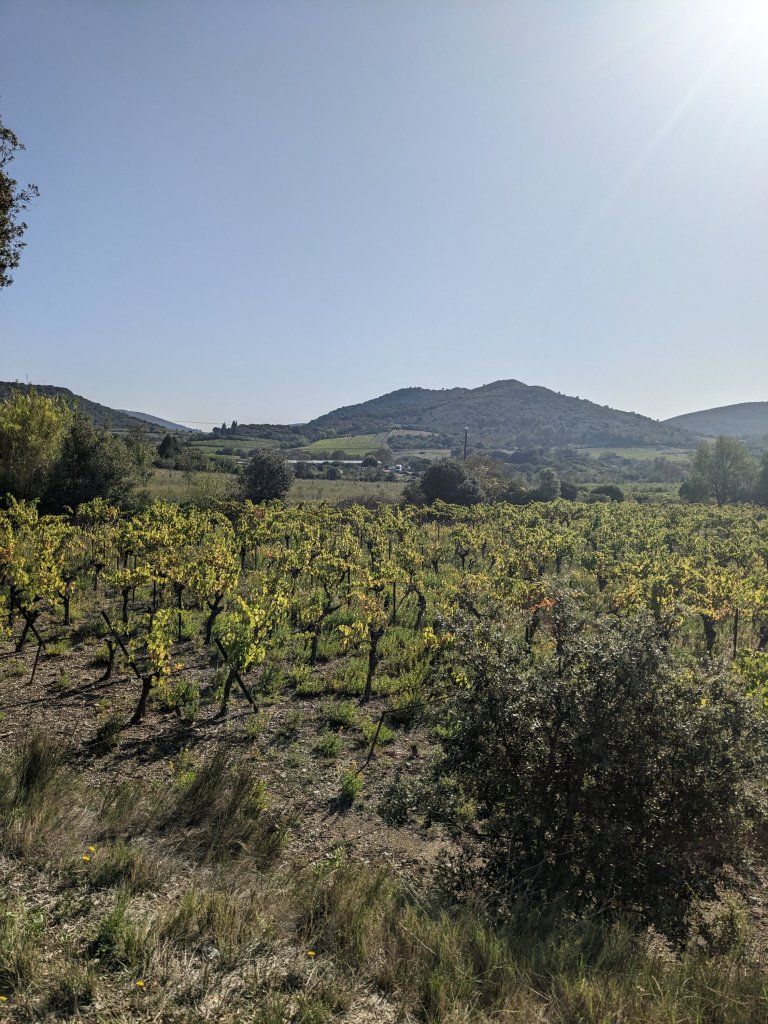 Then as it started to drop, the road hair-pinned its way down through rocks and garrigue, before that turned back into vineyards and the road started to roll towards Caux.