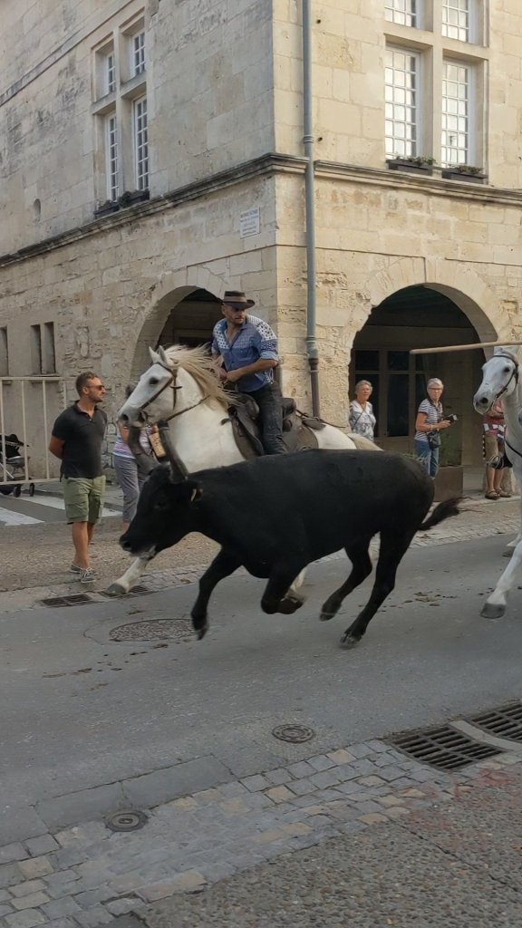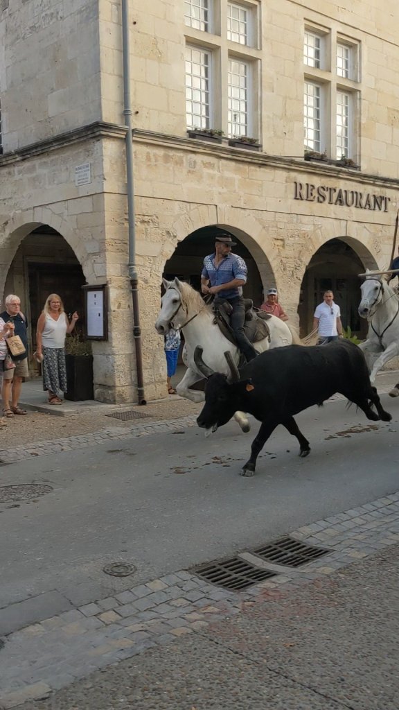 Booking into our apartment for the night, we found out that we had arrived during the town’s Fete Votive, ten days of celebration and events involving the local black bulls and Camargue horses. If we were quick, we would even be able to watch the bulls being run through the village streets, with outriders to control them.
