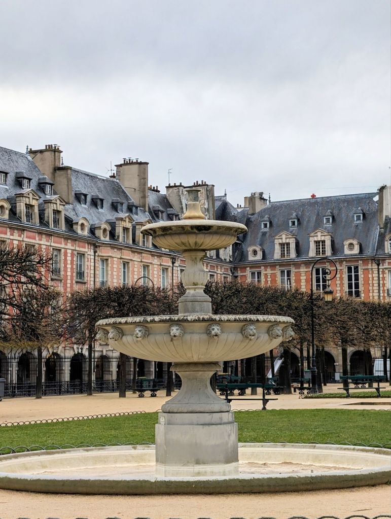 We found ourselves walking through the stunning Place Des Vosges with its elegant buildings set around the small park, everything dripping with water after the recent rain…