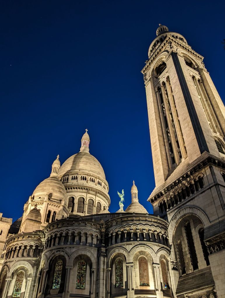 After a brief sit down, we headed out again, taking the steps above the apartment to the top of Montmartre and the Sacré Coeur, which looked spectacular against the cobalt blue of the early evening sky.