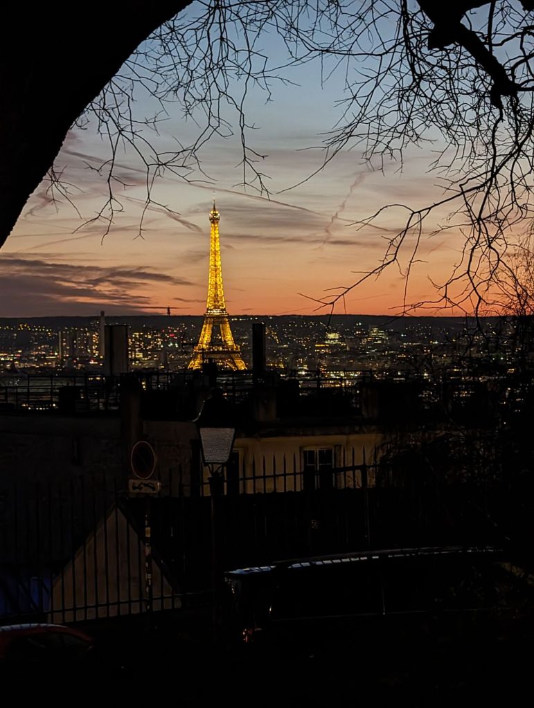 That said, it is still a very beautiful place to watch the evening settle over the city, with the dark skies behind and the peach, apricot and golden tones of the sunset beyond the stunning sight of the Tour Eiffel, sparking with lights.