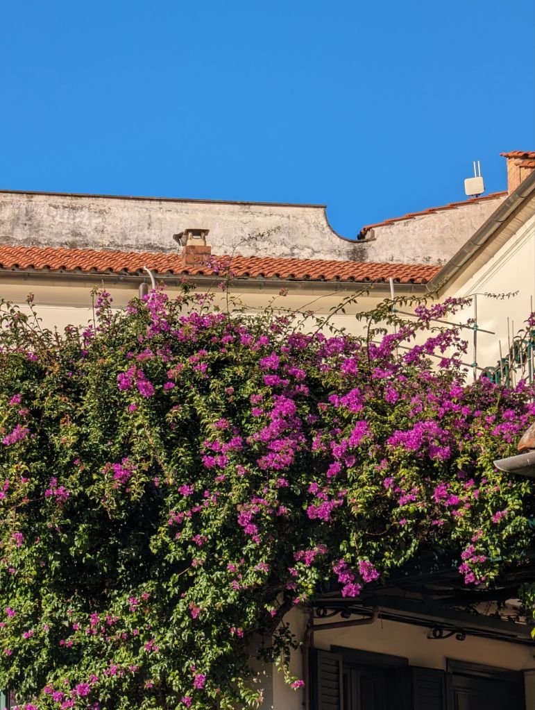 The road to the centre of town was lined with orange trees, all heavy with fruit; their dark green leaves and vibrant fruits unexpectedly bright after having spent 2 days in the city. Turning a corner, a Bougainvillea was a tumble of purple flowers across the top of an old wall too. It was so wonderfully colourful after the winter days in Provence.