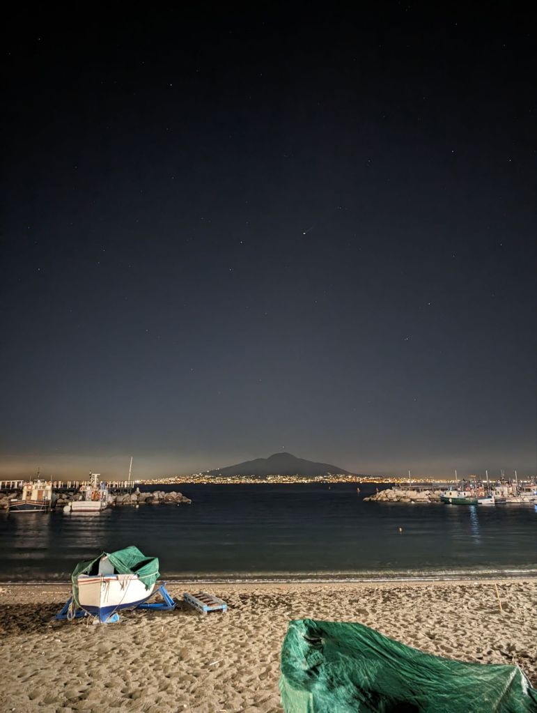 So we ended the day with an evening walk around the town, heading down into the old Marina, with its beautiful view, across the old boats to the sparkling lights of Naples, and the looming majesty of Vesuvius.