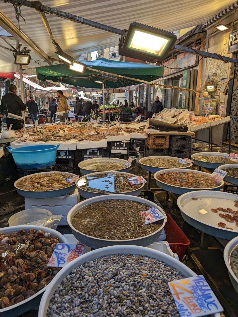 Heading back out, we walked past shops that were reminiscent of the Roman ones we had seen below the surface. Small shop fronts, onto narrow lanes with their goods spilling into the street. No more so than when we ambled into an area filled with fish and fruit shops. It was like nowhere else we’ve seen recently.