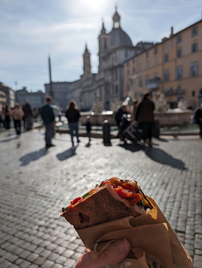 Before crossing back into the city and heading back to sit in the Piazza Navona with a toasted focaccia sandwich that we had bought for lunch.