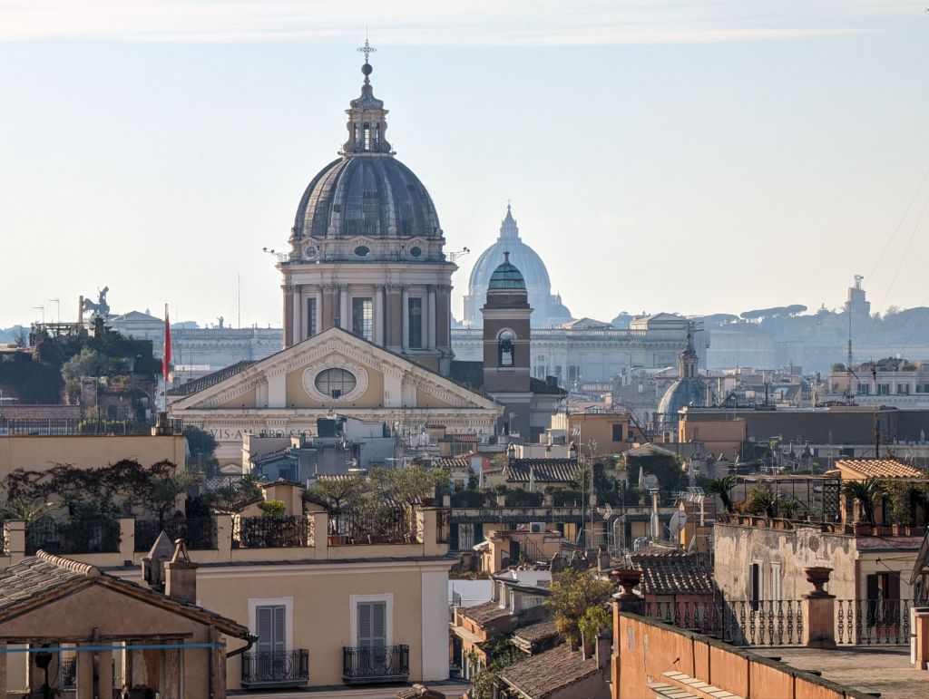 From here we walked on to the Spanish Steps, which always makes me think of Audrey Hepburn & Gregory Peck in Roman Holiday, climbing them to the church at the top, where we stood and marvelled at the skyline, with its higgledy-piggledy mix of rooftops, church towers and domes, with St Peter’s dominating them all .