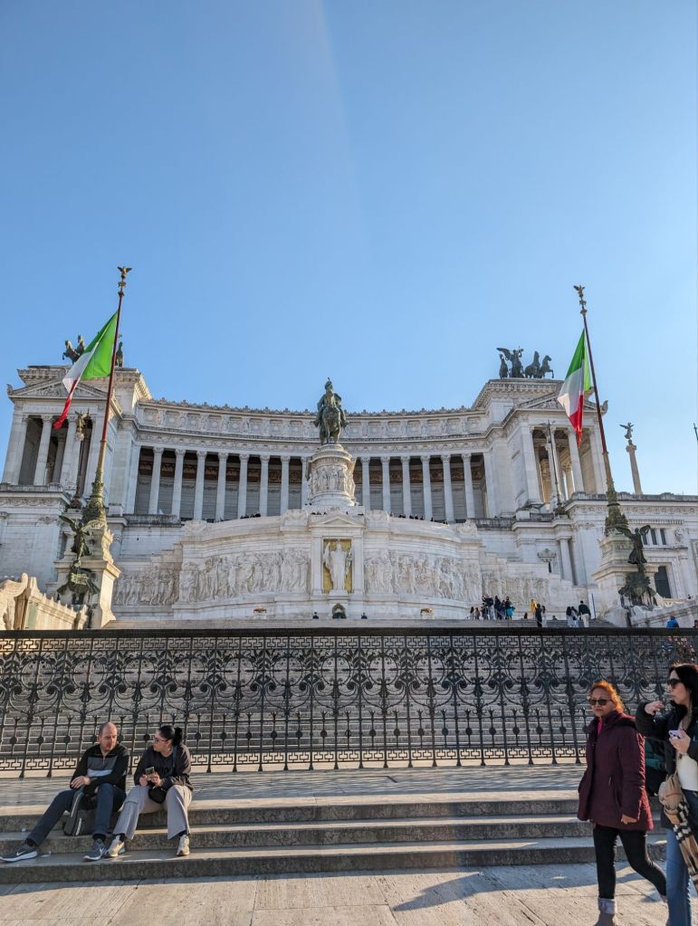 We emerged from this peaceful, contemplative area to the side of the Vittoriano Emanuele II memorial, an awe-inspiring, white marble structure topped by dramatic statues. A huge monument, home to the Tomb of the Unknown Soldier, which now has a lift that gives access to the roof, which must have amazing panoramic views across the city (if you don’t mind heights).