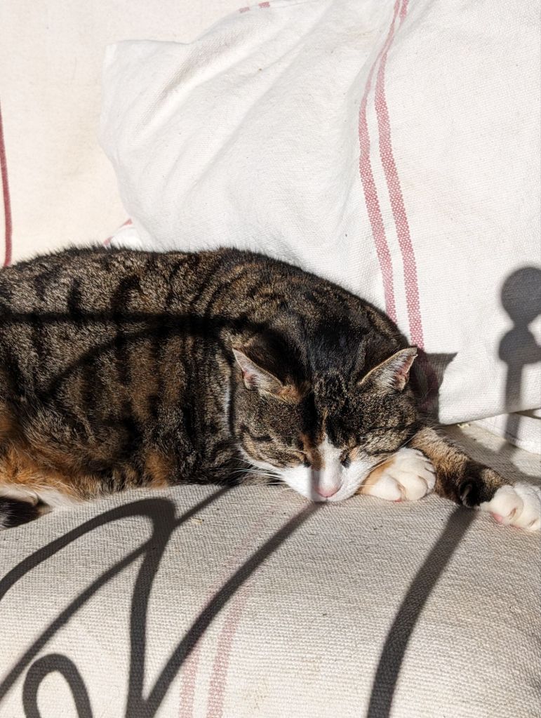 At this time of year, it would be fair to say that normally the weather is settled, calm and generally lovely . By now, we have usually set up the cushions on the old day beds, under the shade of the pergola, and have the parasols on hand, even in the early morning to shade our eyes, as we sit on the terrace having breakfast, whilst Pusscat happily snores in the sun