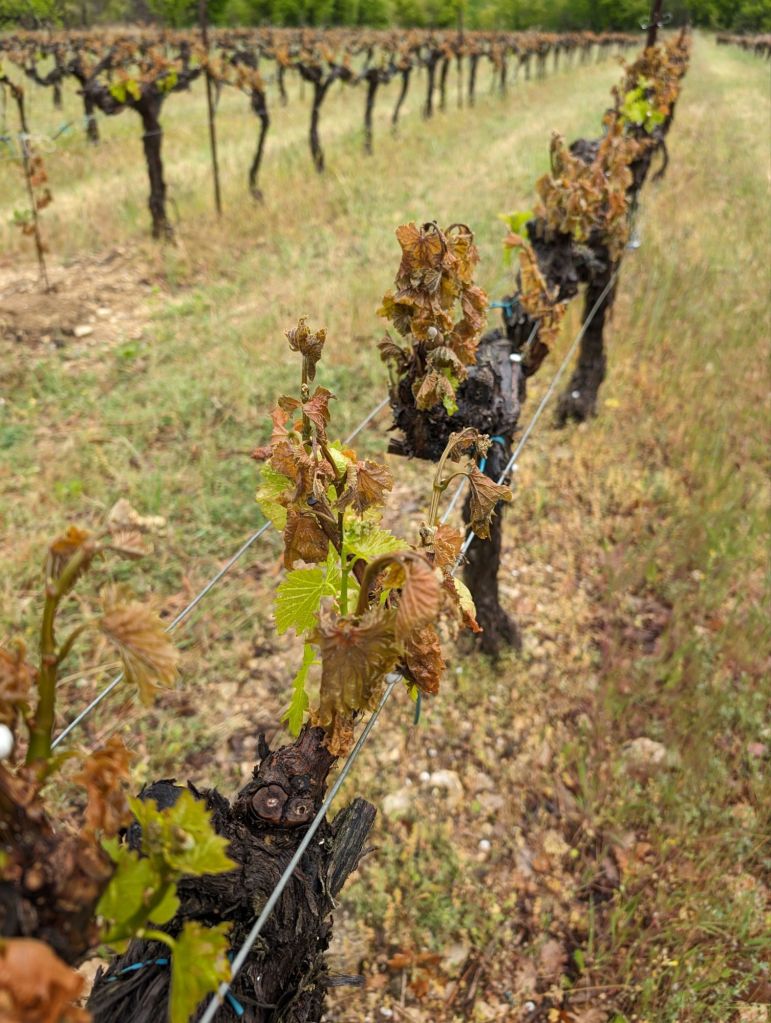Sylla (one of the big local wine producers) reported having lost 100% of this year’s vines, on parcels of land around Gargas. And as we walked and cycled, we noticed that the new growth on many of the local vines had turned brown and died in the frost, devastating the year’s work and the future harvest