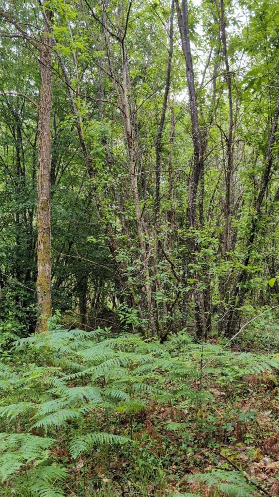 Here, the woodlands too, have a different feel to them. The moister climate ( although still in the southern half of France) enables the trees to thrive, so different from the scrub oaks and pines, on the hillsides above home. Here the tree canopies are so dense in places that the woodland floor hardly sees the sun, and the ground is covered with emerald green bracken, with a few dog-roses, fighting for space and light.