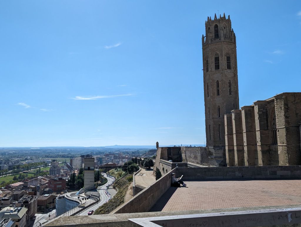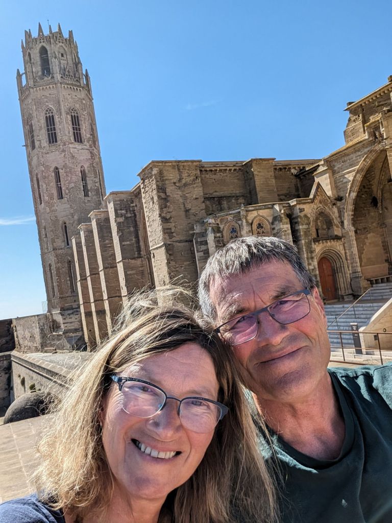 We climbed to the cathedral and castle at the top of the hill (as if we hadn’t done enough exercise for the day). It was worth the climb, as the views were spectacular. A 360 degree view of the land around the city, with the bulk of the Pyrenees to the north and a view, beyond the bell tower to where we’ll be cycling tomorrow.