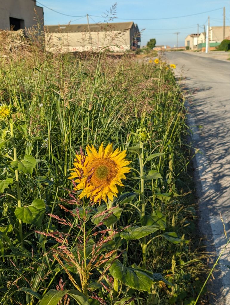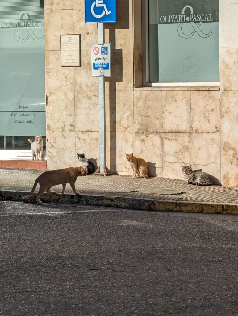 Then stopped for coffee in the village of Arbeca, about a third of the way into today’s ride. The early clouds had already melted away and we sat in the sun, listening to the babble of voices, watching a group of cats all trying to sit in the sunniest spot against a wall.