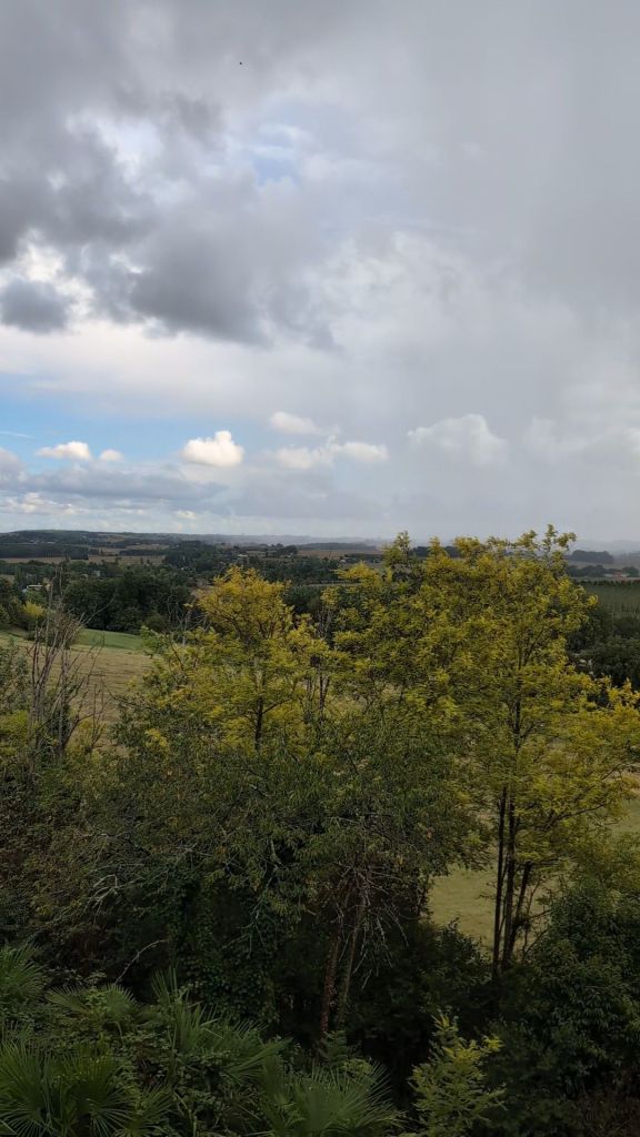 It wasn’t long-lived and within 30 minutes it had passed and we were able to cycle out, continuing towards Duras, splashing through deep puddles as we left the town.