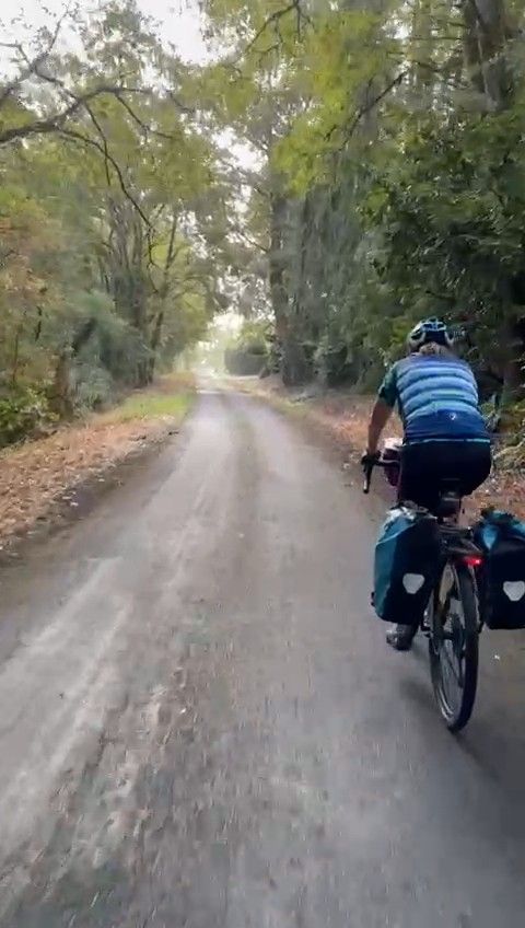 As we cycled on, the sun finally made a short appearance, between the clouds and lit the forest floor, waking the birds too, which burst into song around us.