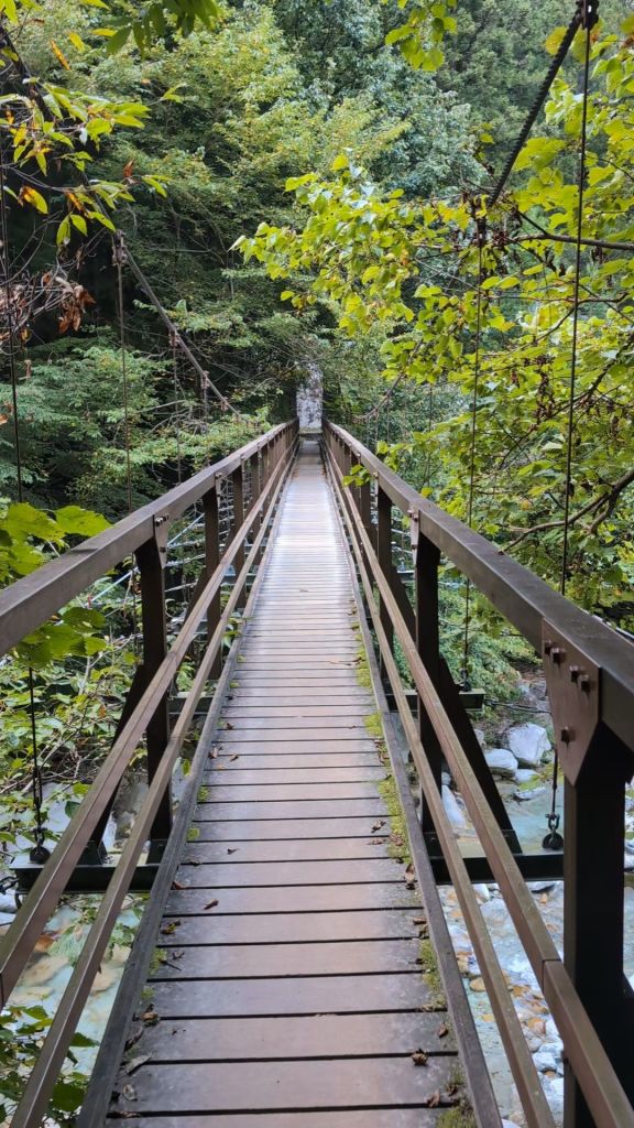 From there we wandered on, taking a path that went across a rather bouncy suspension bridge. Below, the clear water babbled over the pale rocks in a series of little falls..