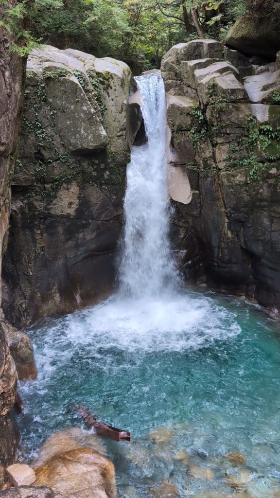 It proved to be a good decision, and after negotiating our first Japanese car park payment machine, we followed the signs for the falls. The path took us alongside another crystal-clear river running over white rocks, the water looking turquoise in the pools that it formed along the way.