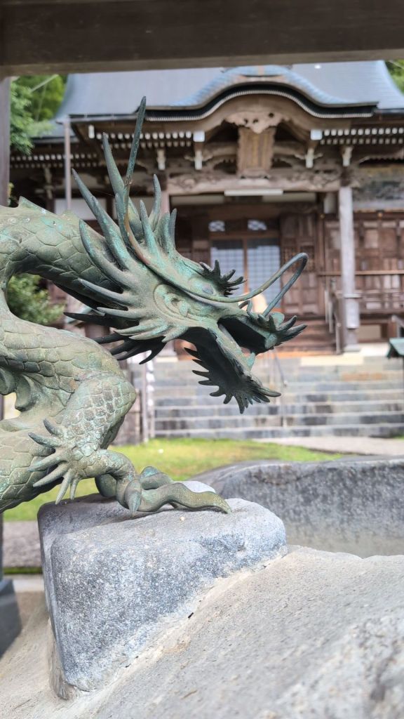 The Ryujin Falls were a torrent of water spiralling over the edge of a 12m drop, which is the fabled home of the White Dragon, which is represented in various ways around the site. Ryujin means ‘Dragon God’ and the story is that one day, after being disturbed by a ‘bad man’ a white dragon rose up from the falls, infront of the local people and flew off to heaven, hitting the mountainside, a little higher up, where its scales fell, to create another fall.