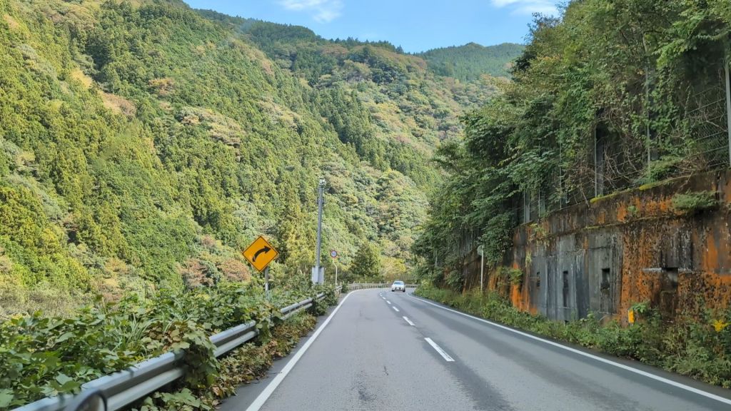 Then below Matsuyama the road changed again and became quieter, passing through small villages and towns along the way. The road was really rather beautiful, following the course of a mountain river, with steep forested hillsides to either side of us.