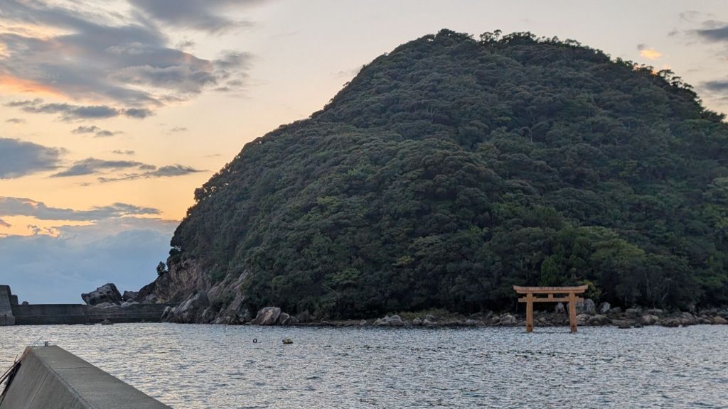 Yesterday evening, when we had been on the sea-wall, watching the sunset, we had noticed a Tori Gate, in woodland high above the town, so decided to take a walk, before heading on.