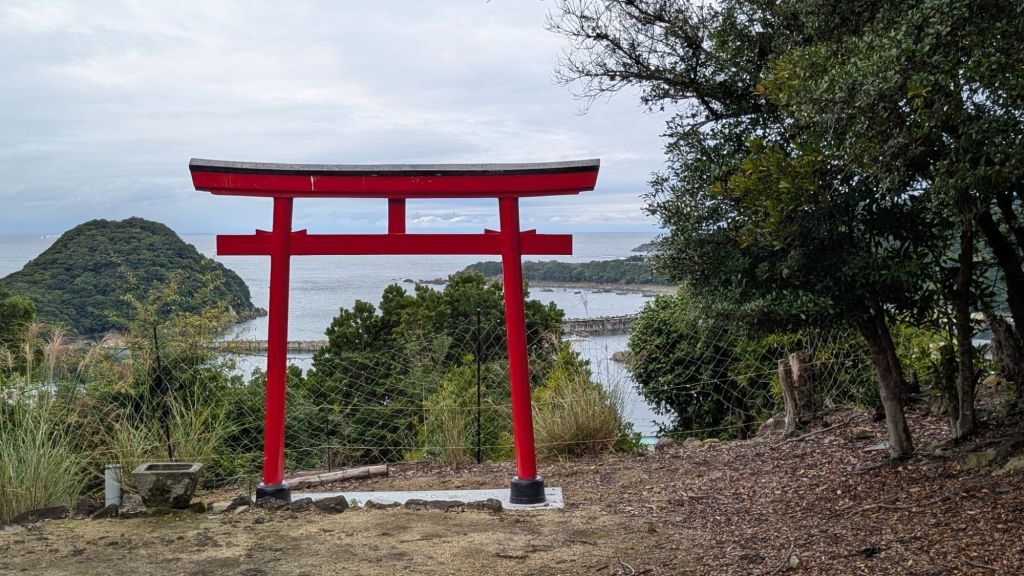 But the view was worth the climb, with the Tori Gate, in front of a little shrine, framing the view of the bay, below us.