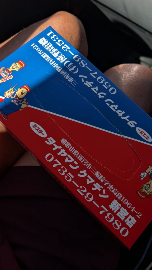 Happily Mr Tyre Man could help, and within a few minutes, they had topped up the tank, and when I paid (527 yen – £2.75), they gave us a box of complementary tissues, as a thank you for our business.
