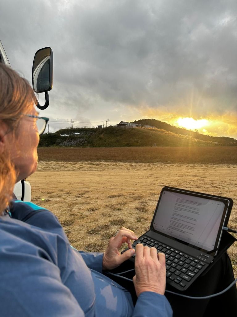 Waking this morning, we pulled down the blind, to a glorious view of the sea, just behind the van. The bank of cloud wasn’t what we expected, and the way that the van was rocking in the wind, we quickly changed our plan for another bike ride today.