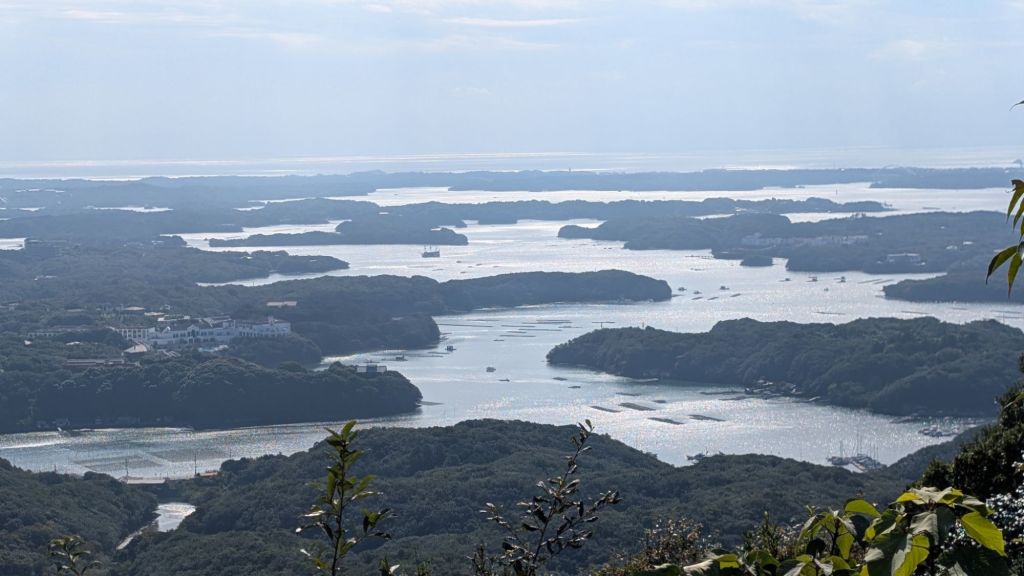 The bay is dotted with about 60 islands, and is a beautiful sight from above, with the sun sparkling on the water. It is home to pearl cultivation, and we could see the oyster rafts in the water, between the islands.he cultured pearl trade started here in the late 1800s and the area still appears to produce a third of Japan’s pearls.