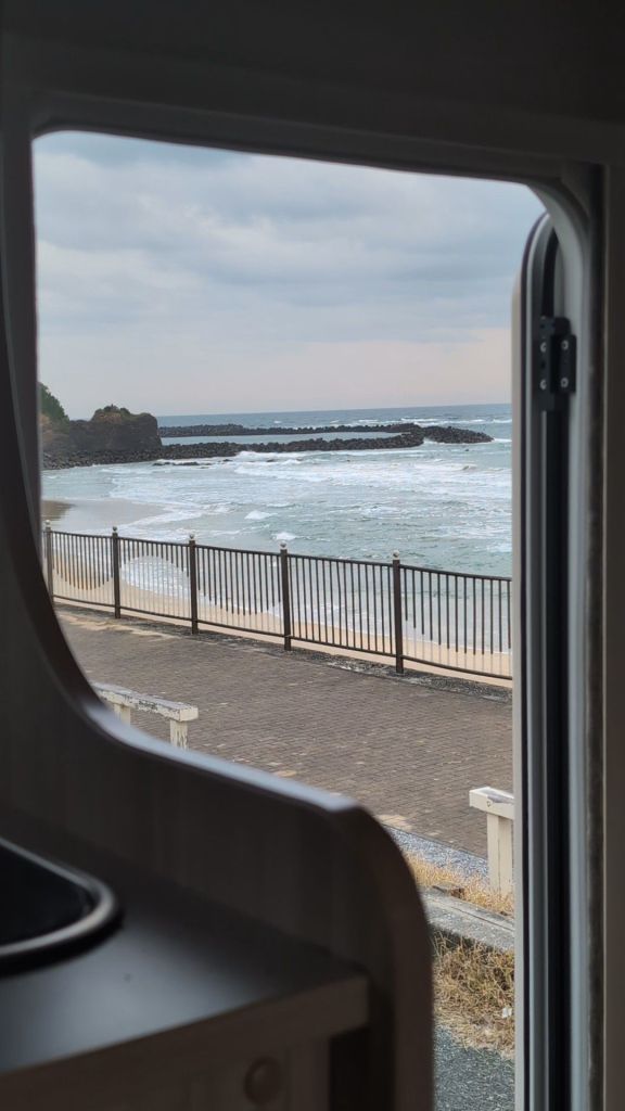 Having decided to stay at the beach near Shima again, we were both woken in the middle of the night by the roar of the sea, which seemed to have been whipped up by a wind.
