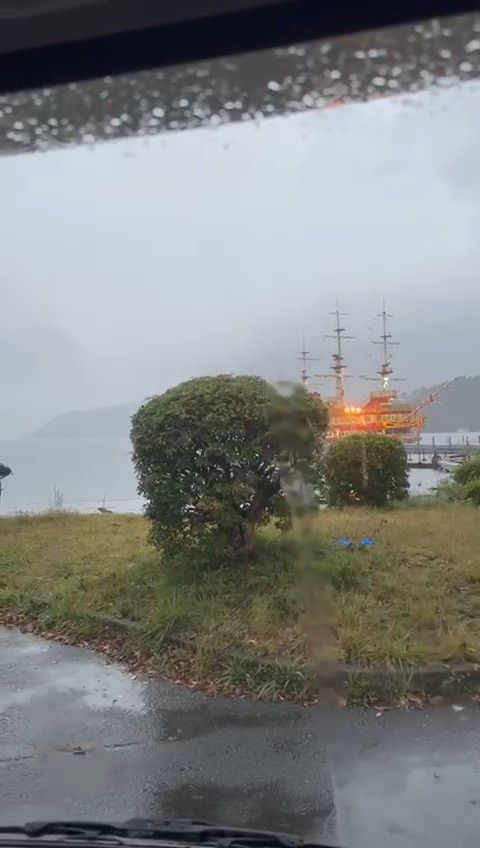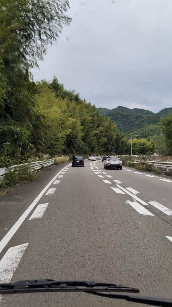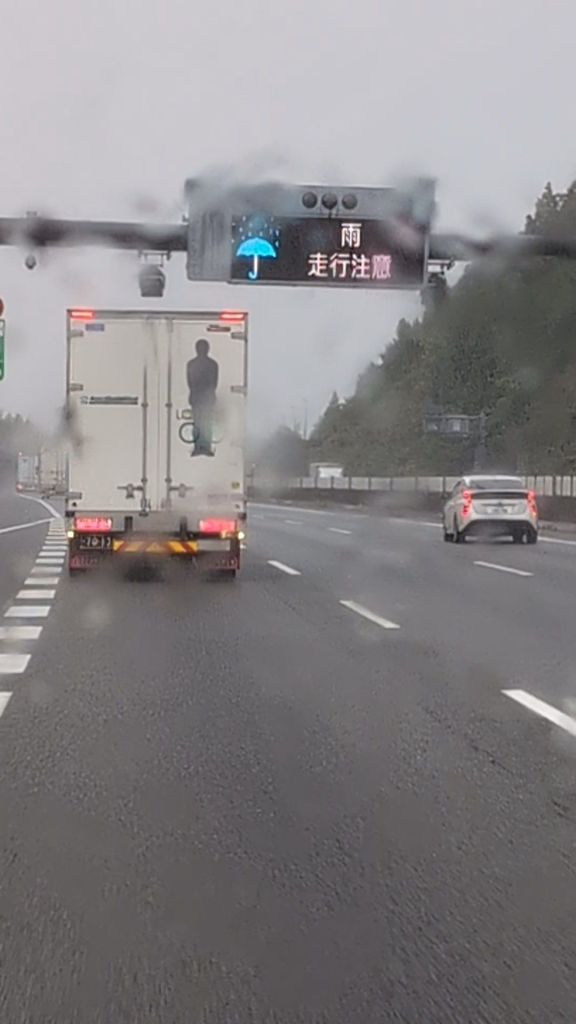 We stopped in Shizuoka for an onsen, having broken the back of the journey, but whilst we were there, the predicted storm caught up with us, and when we set off again, the roads were awash with water, and the wind was buffeting the side of the van.