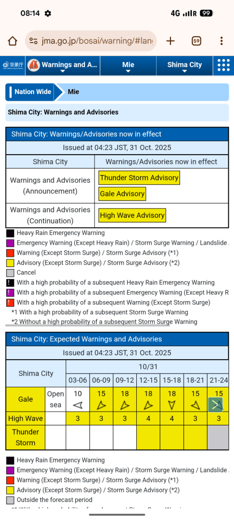 The only worry was that we had planned today’s route, with a little ferry trip across Ise Bay from Toba to Irago, and the sooner we could cross, the less bumpy it would be.