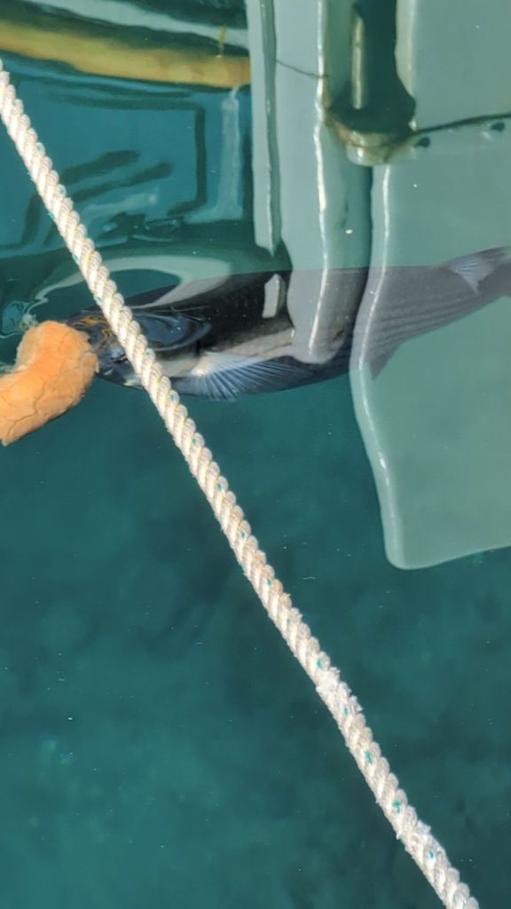And being entertained by life going on in the water below our feet, From a cormorant chasing small fish, in and out of the mooring ropes, to a fish enjoying a second breakfast too, from a slice of baguette that was floating on the surface of the harbour.
