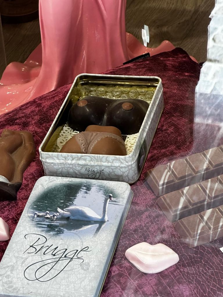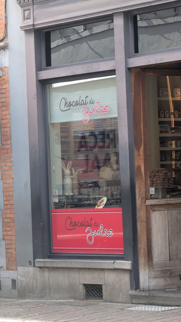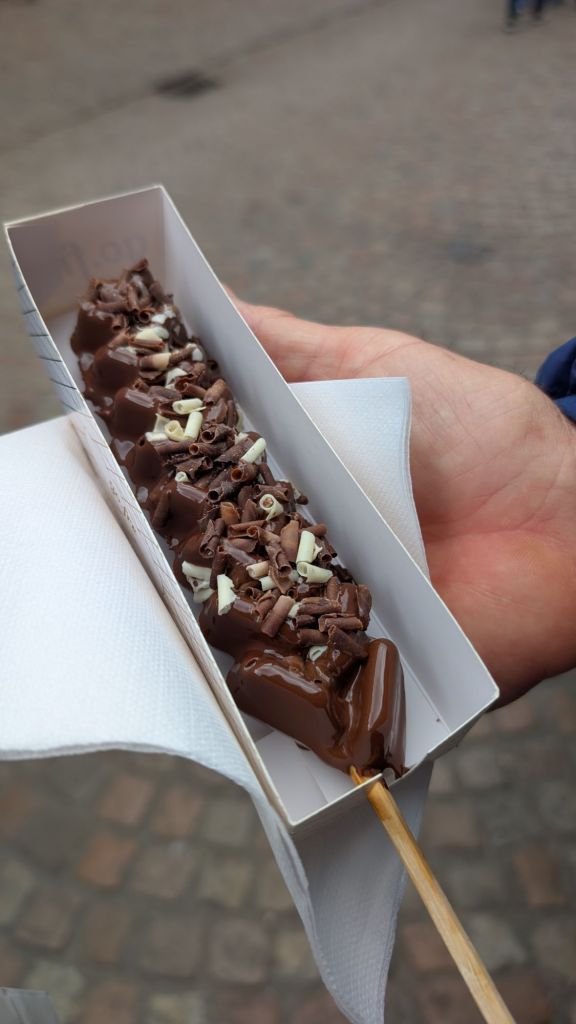 Being in Bruges, we had to have a waffle, and plumped for one on a stick, coated in melted dark Belgian chocolate and chocolate shavings.