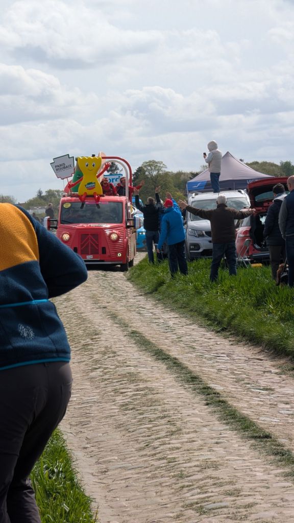 We were glued to the screen, watching the race unfold, a they drew closer to us. In fact, we were so engrossed that we almost missed that the Caravane had started coming across the cobbles towards us.