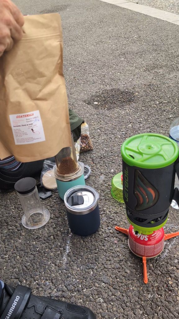 We took the opportunity to buy lunch from a local boulangerie, finding a bench to sit on, while Andy got out his favourite new toy (the Jetboil), and set about making us a roadside coffee, with the ground beans we had bought yesterday, in Cavaillon.