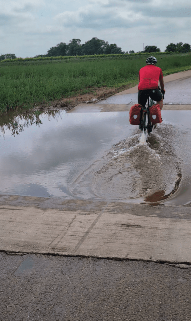 No problem, said Andy, who decided to see if it was passable, or if we would need to take off our shoes and socks & wheel the bikes through.He took a gentle run up, and rode elegantly through the water, which came halfway up his wheels.